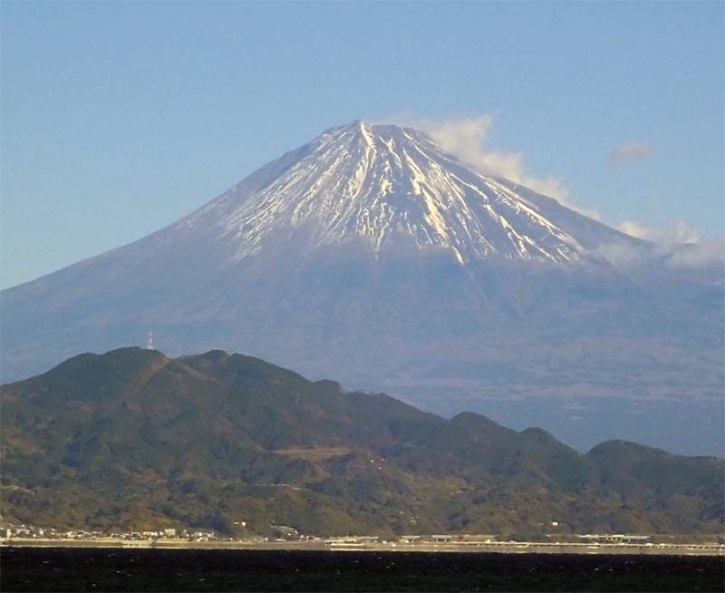 新幹線富士付近から三段の笠雲がかる富士山 |